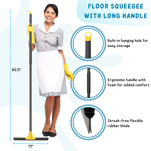Squeegee Broom for Floor, 18'' Rubber Squeegee with 60'' Long Handle for Bathroom Tile, Garage Concrete, Deck, Shower Glass, Window Cleaning, Heavy Duty Household Floor Wiper