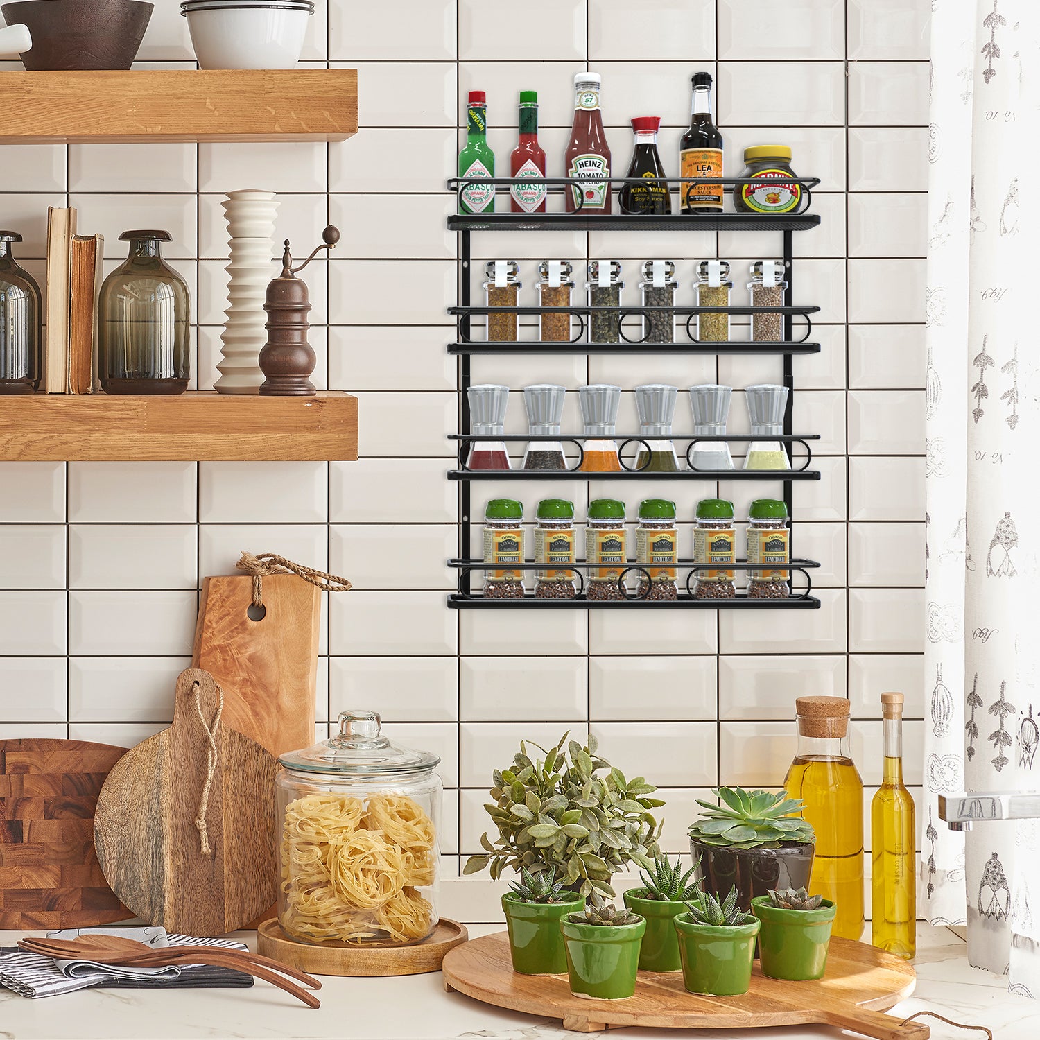 - 👍【Easy to reach at One Glance】Hanging spice rack wall mount display your selections clearly so you can quickly identify the items you need. There are guard rails on the shelf sides, which are narrow spacing that prevents items from falling through.