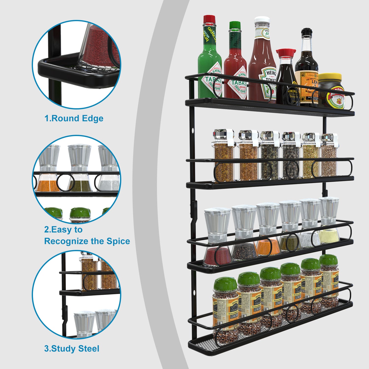 - 👍【Easy to Mount and Sturdy】There are 2 packs spice rack organizer and different size of hardware in the package. constructed of durable steel, it will last for years to come.fit for kitchen wall , pantry door , bathroom,cabinet door.