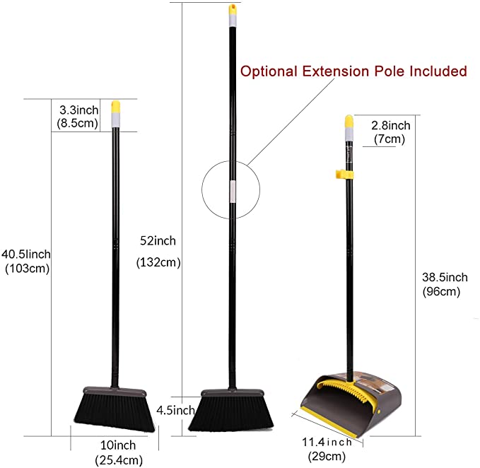 - 🏡Humanized Design on Dust Pan: Dustpan locks in open position for easy emptying and features teeth to comb out dirt and dust from broom bristles,The rubber lip of the pan is flush with the floor and the teeth clean out the bristles easily