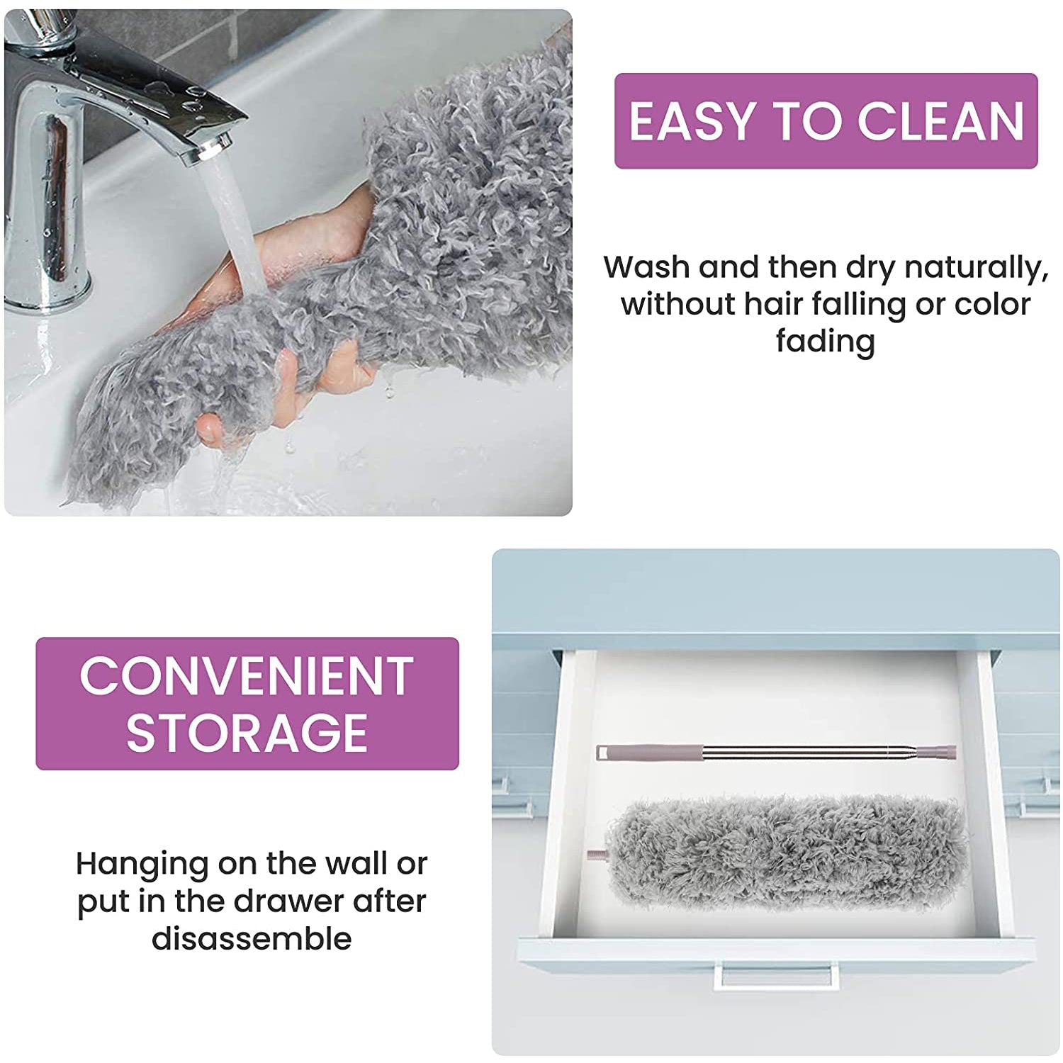 - 【Reusable Duster】 Microfiber fabric can be hand washed after use, simply soak it in warm water, rinse, and air dry. With a soft rubber tip prevents the top from scratching surfaces and the hanging hole at the base of the pole makes it convenient and easy to store the duster.