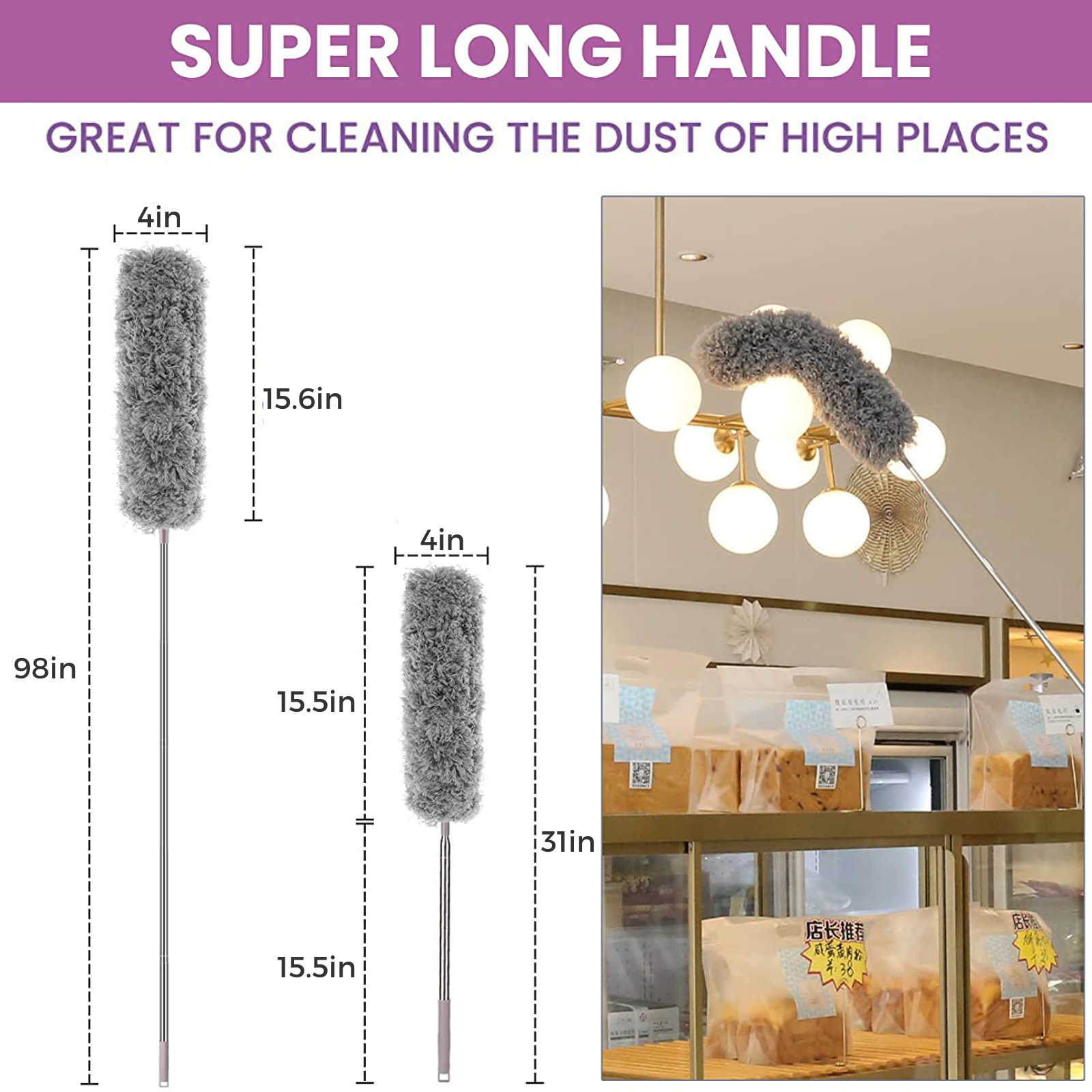- 【Telescoping Stainless Steel Handle】 The long duster has a sturdy but lightweight and comfortable handle that stretches from 31 inches to 98 inches, with plenty of reach to not become wobbly or unbalanced. You no longer have to risk falling of the chair in order to clean.
