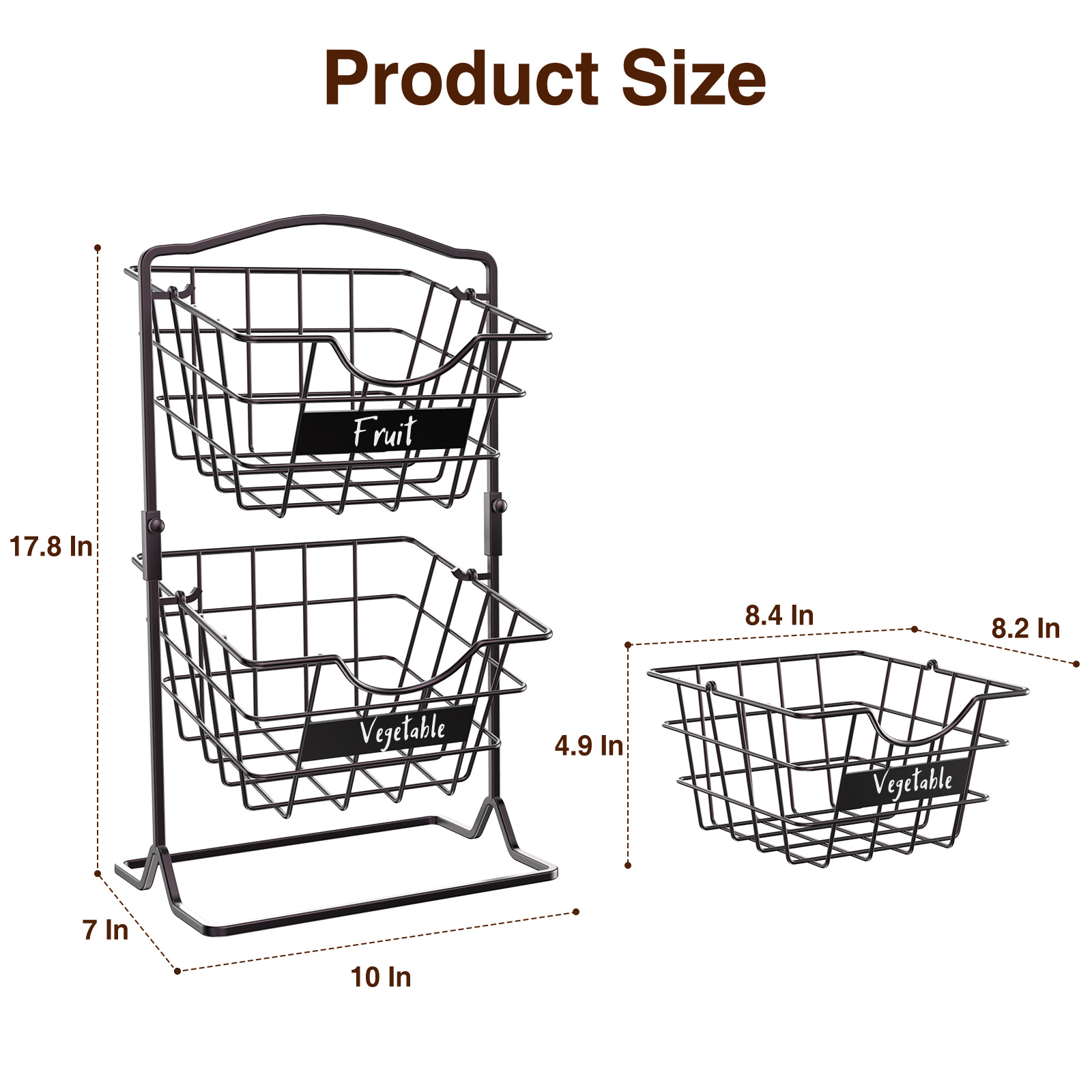 - 【Utilize Your Kitchen Vertical Space】 2 tier hanging basket provides you with plenty of room to accommodate various fruits and vegetables without taking up too much space, (Measures 10" x 7" x 17-4/5") perfect for storing on countertops for easy access to fruit for all.