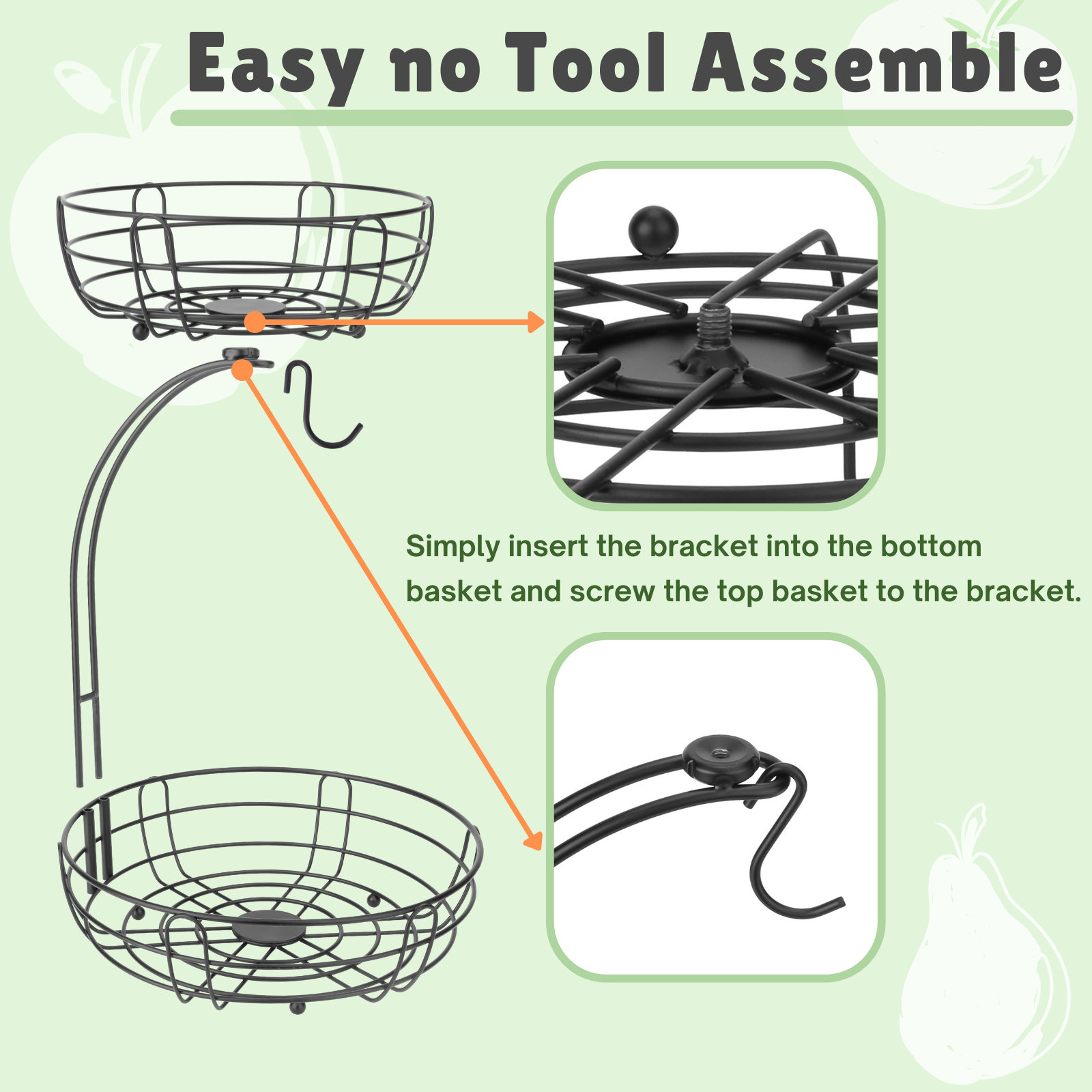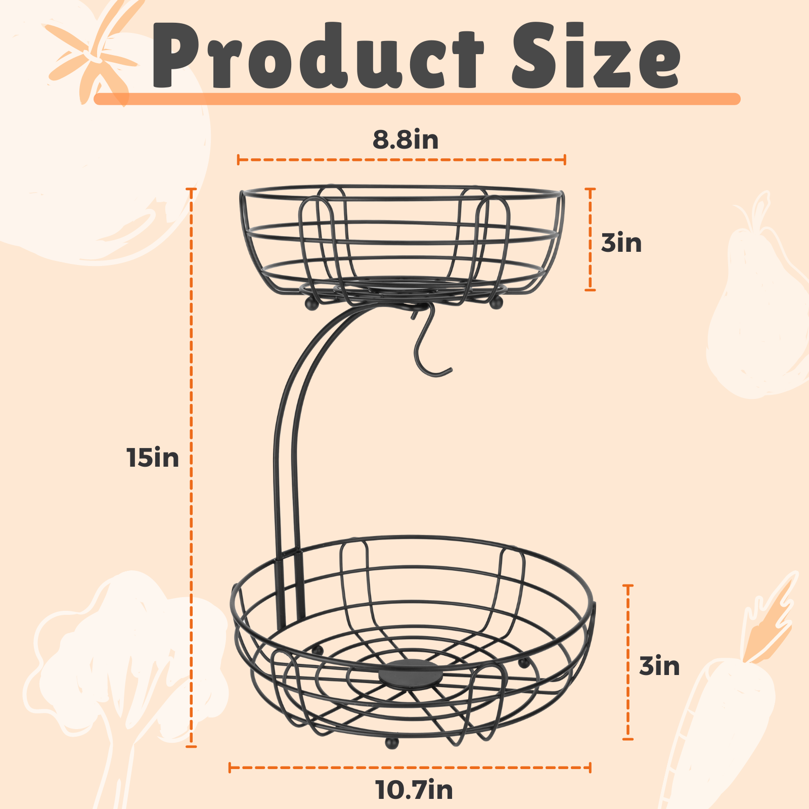 - 【Ample Space】 Kitchen fruit basket with spacious and open design provides plenty of room, so you can store many fruits and vegetables neatly. This 2-tier fruit basket for counter offers a 10.7-inch bottom basket and 8.8-inch upper basket, saving you a lot of counter space. The total height is 15 inches when fully assembled.