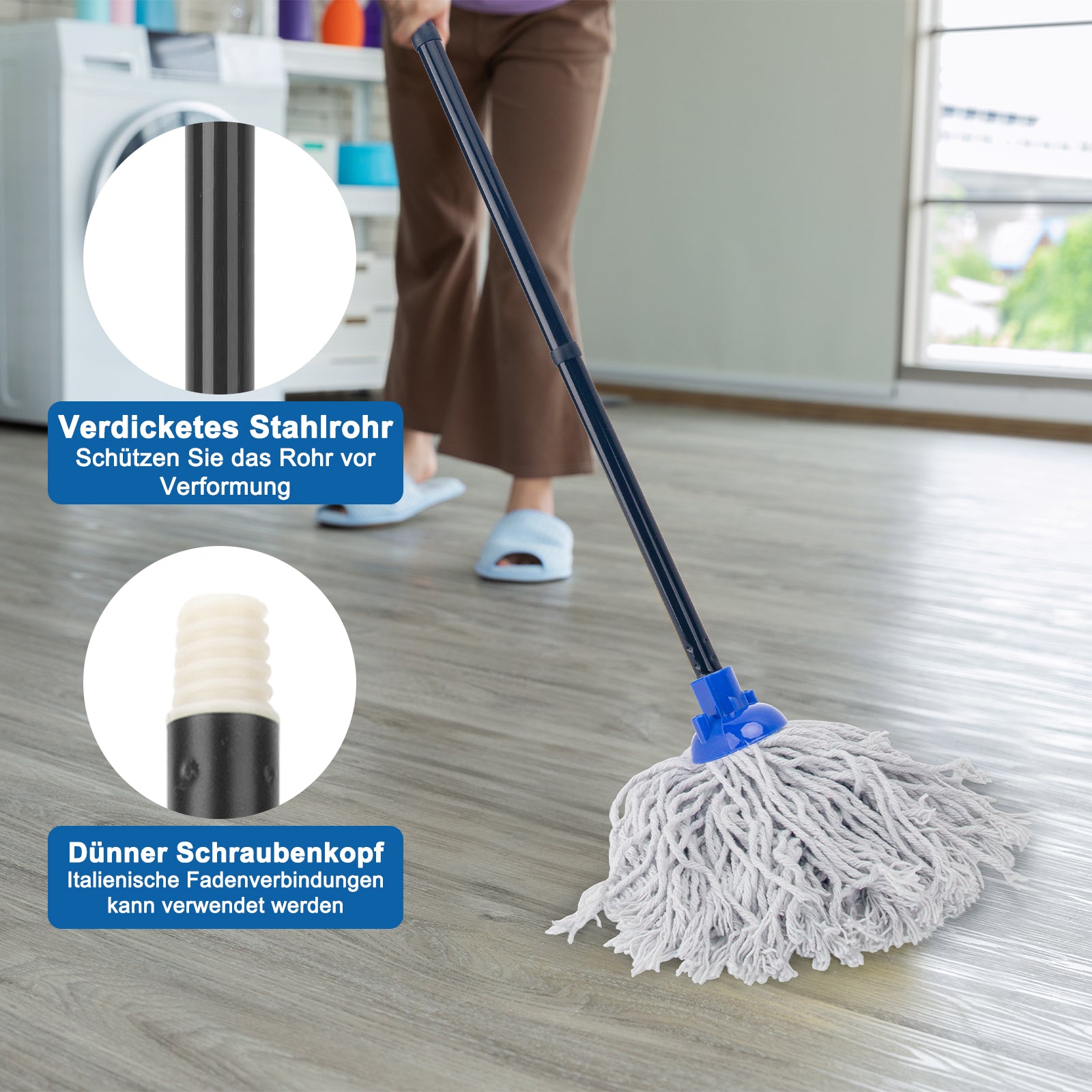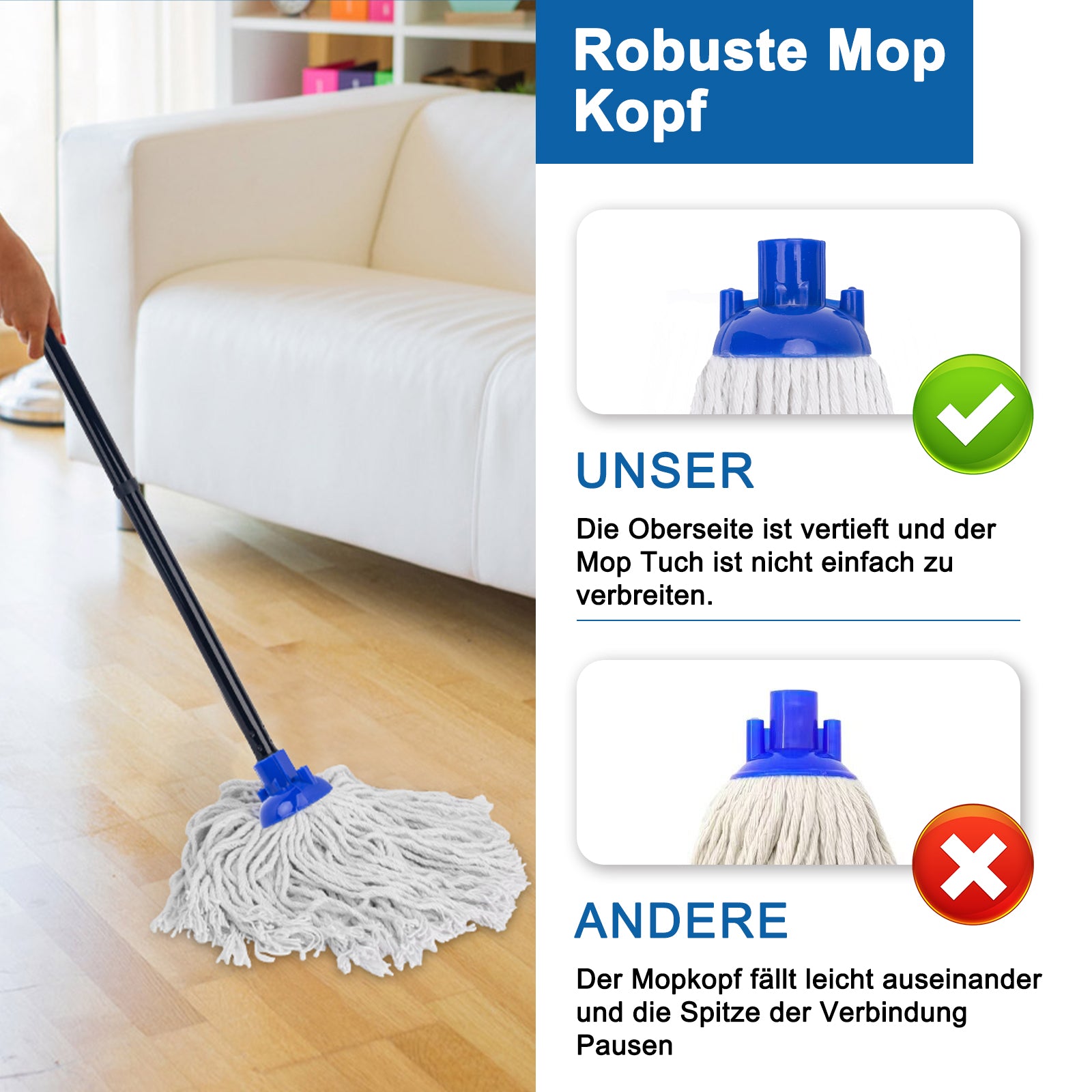 KeFanta Wischmopp für die Bodenreinigung aus 2 Stück Ersatzköpfe aus Baumwolle, 144 cm Metallgriff und Nachfüllung, effektiver Reinigungsmopp für Zuhause, Büro und Gewerbe