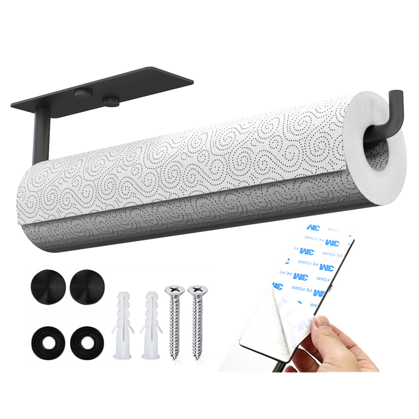 - 【Two Types of Installation】 Under cabinet paper towel holder comes with the necessary mounting hardware (2 screws, 2 anchors, 2 screw caps) and adhesive strips,allow a simple installation on multiple surfaces. Open design makes it easier to add new paper rolls as needed