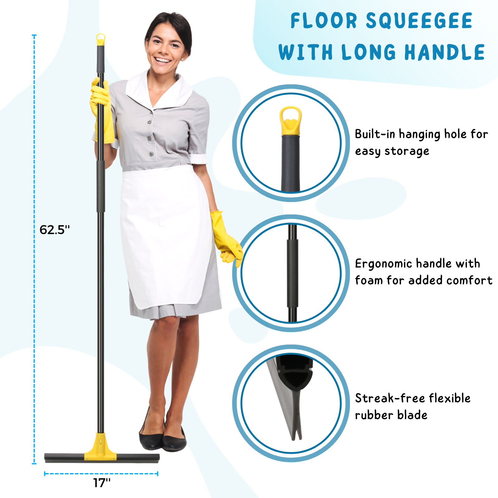 Squeegee Broom for Floor, 18'' Rubber Squeegee with 60'' Long Handle for Bathroom Tile, Garage Concrete, Deck, Shower Glass, Window Cleaning, Heavy Duty Household Floor Wiper