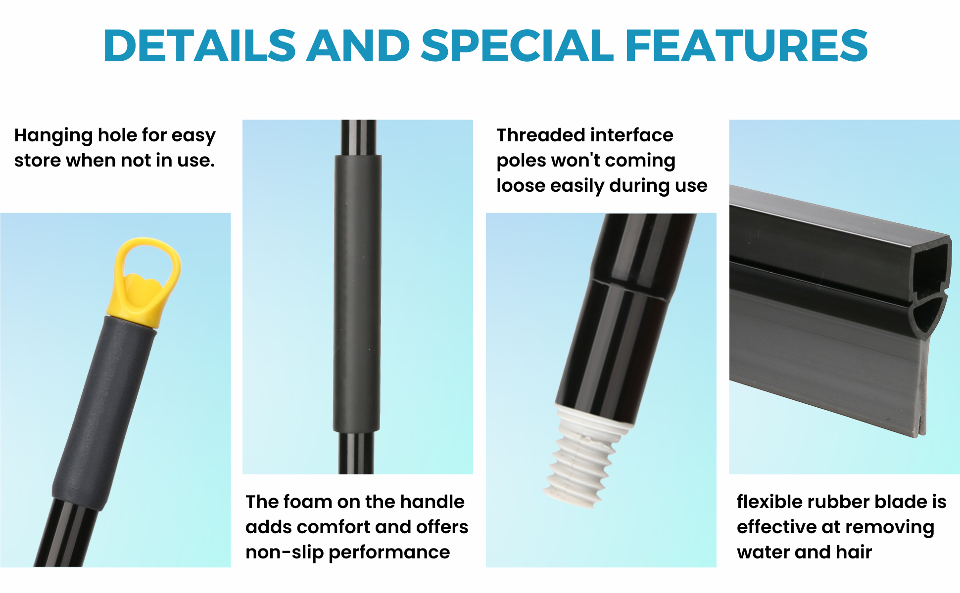 - 🪂Good grip handle &easy to storage -Long handled squeegee for shower with soft grip is non-slip EVA handle grips even when wet,and top pole with hook design to hang conveniently