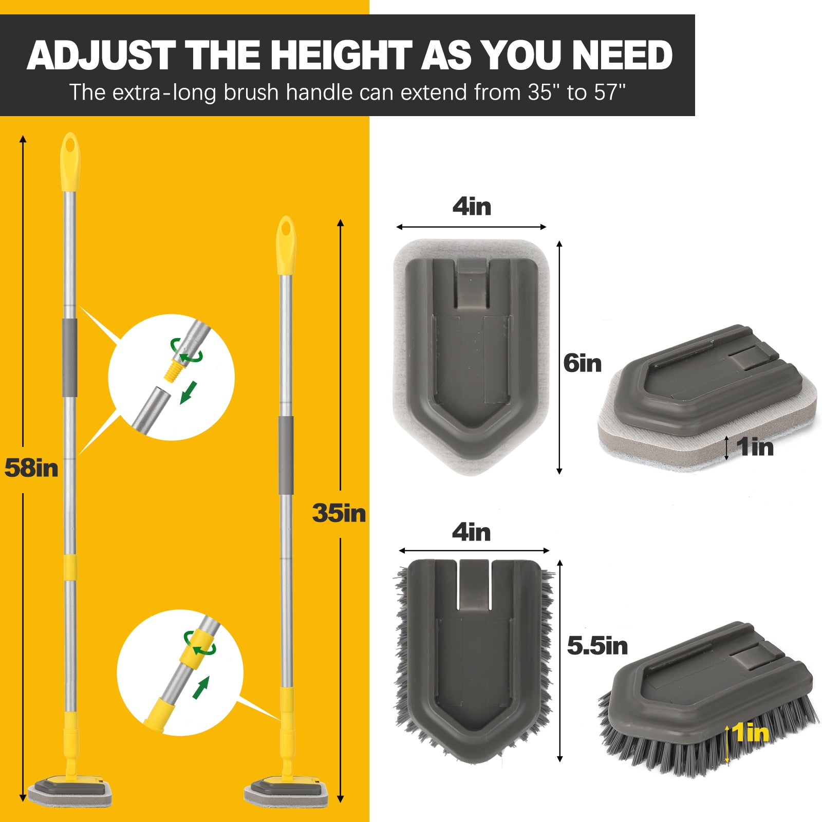 - 🌿Telescopic shower scrubber for cleaning-the shower cleaning brush with long handle can extend from 125cm/49'' to 147cm/58'', the extension part needs to be pulled up and rotated to fix it. once installed, the telescopic handle cannot be removed,plus the brush head can be replaced, great for hard floors, tiles, wall, ceilings, etc. and can remove the handle to scrub the sink and window rails,Save your back, no more bending, climbing, or crouching