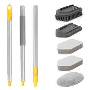 - 🌿Satisfactory Service-Our extendable shower scrubber package include: 3 x extension handle Pole Parts,1 x Stiff Bristle Brush Head ,1 x microfiber pad and 2 x sponge scrubber,1pcs microfiber cleaning pad wipe things dry and no water mark pad for sponge and microfiber mop,If you encounter any problem while using the product, please feel free to contact our support team. We would sincerely serve you.