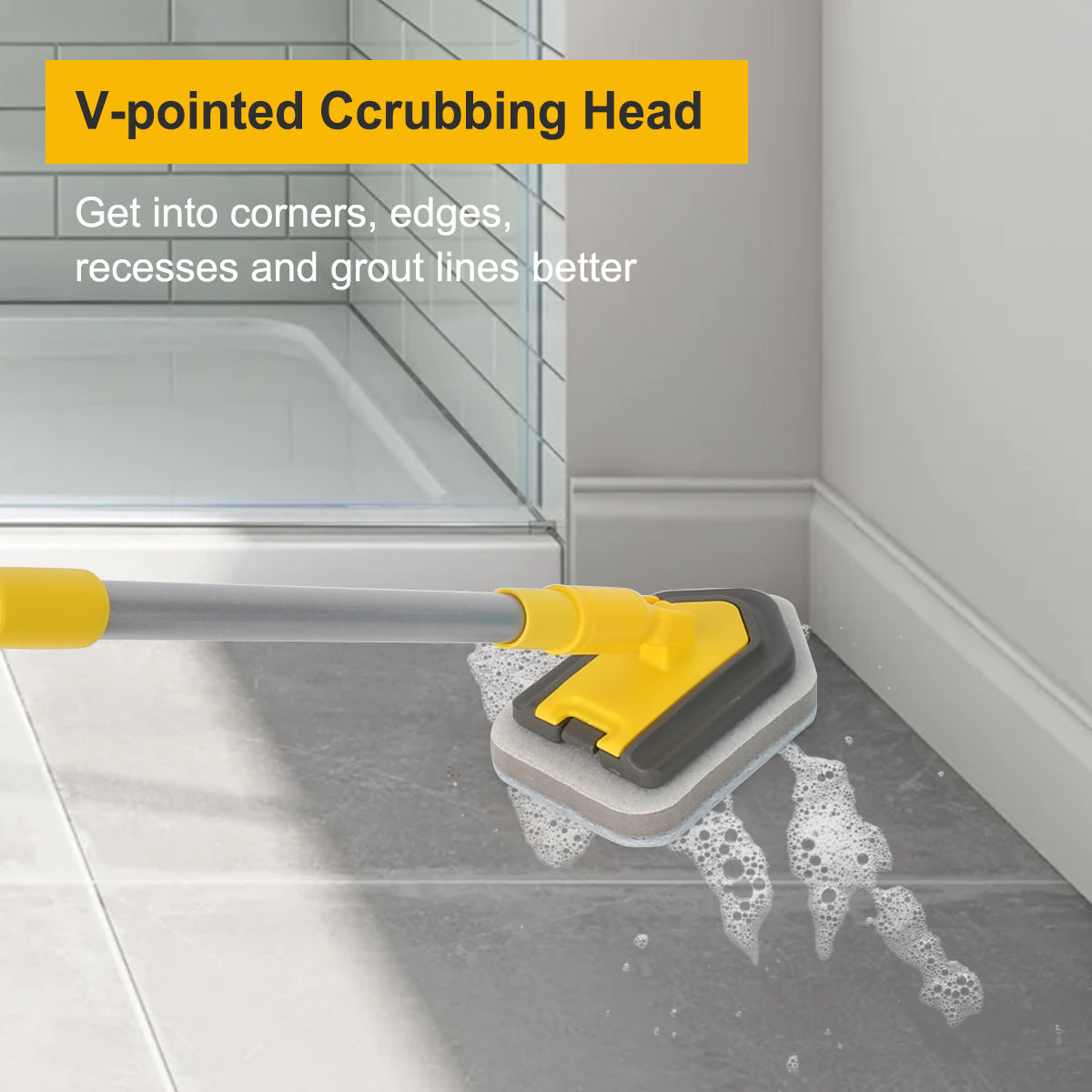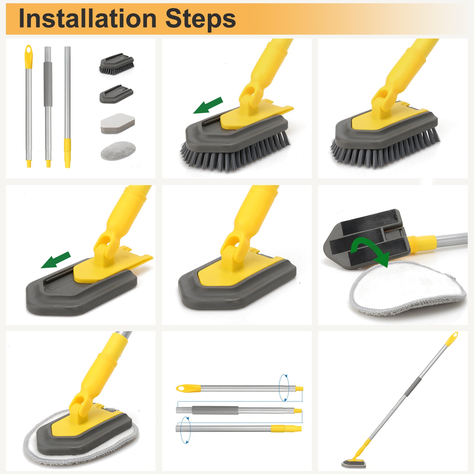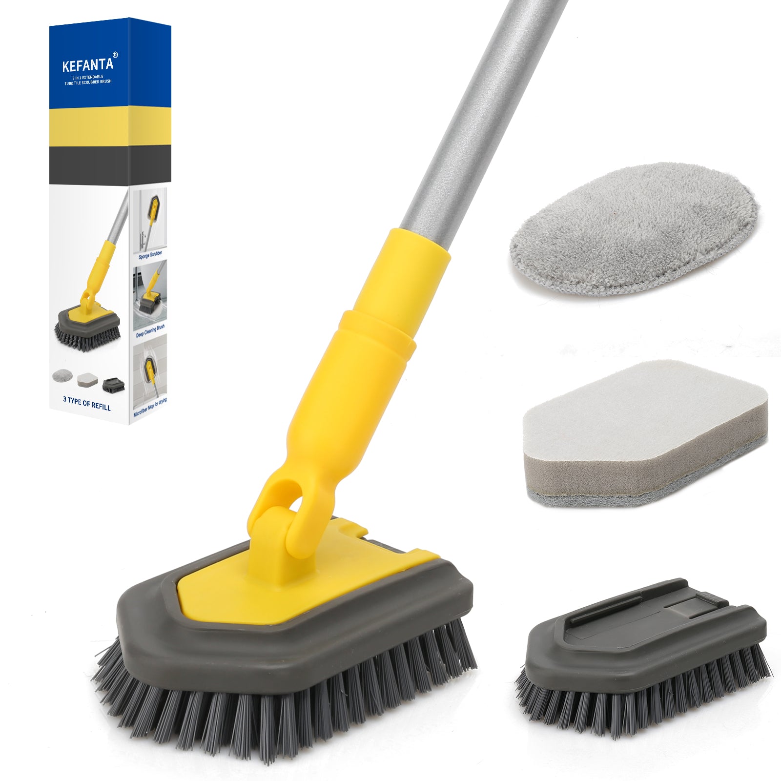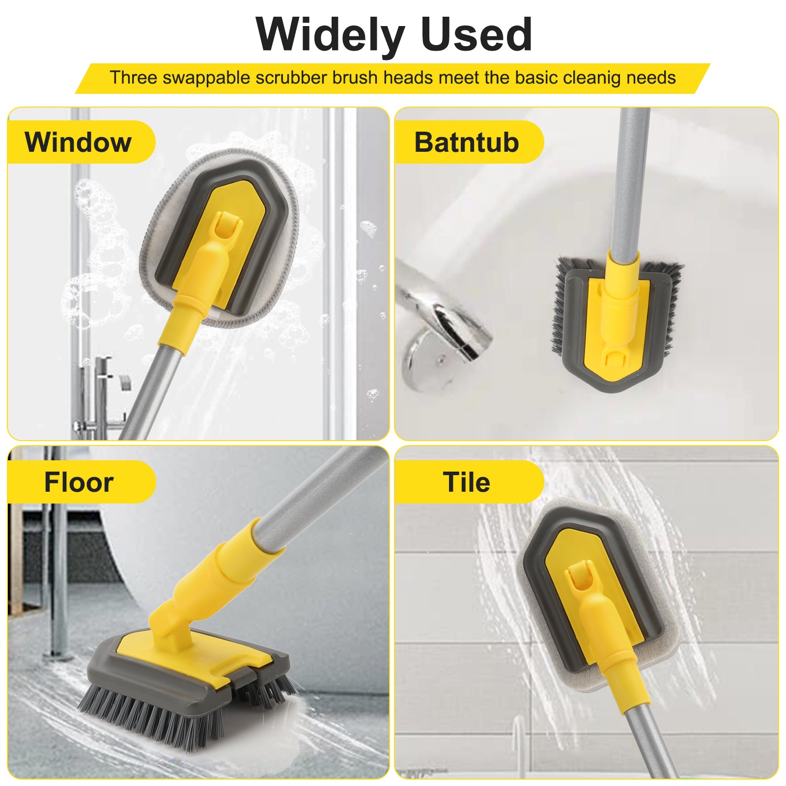 - 🌿Three Different Functions Head-Our tub tile scrubber has 1pcs sturdy stiff bristle brush head-made of high-quality PP material, not easy to fall out, with swiveled head pivots for scrubbing tough grime, hard to reach spots,corners and recesses as well as grout lines at different angles, 2pcs thick sponge,1pcs microfiber cleaning pad is used to scrub water stains,highly deep cleaning while non-scratch,no water mark It is suitable for cleaning glass,wall, ceramic,mirror, tile,bathtub etc.