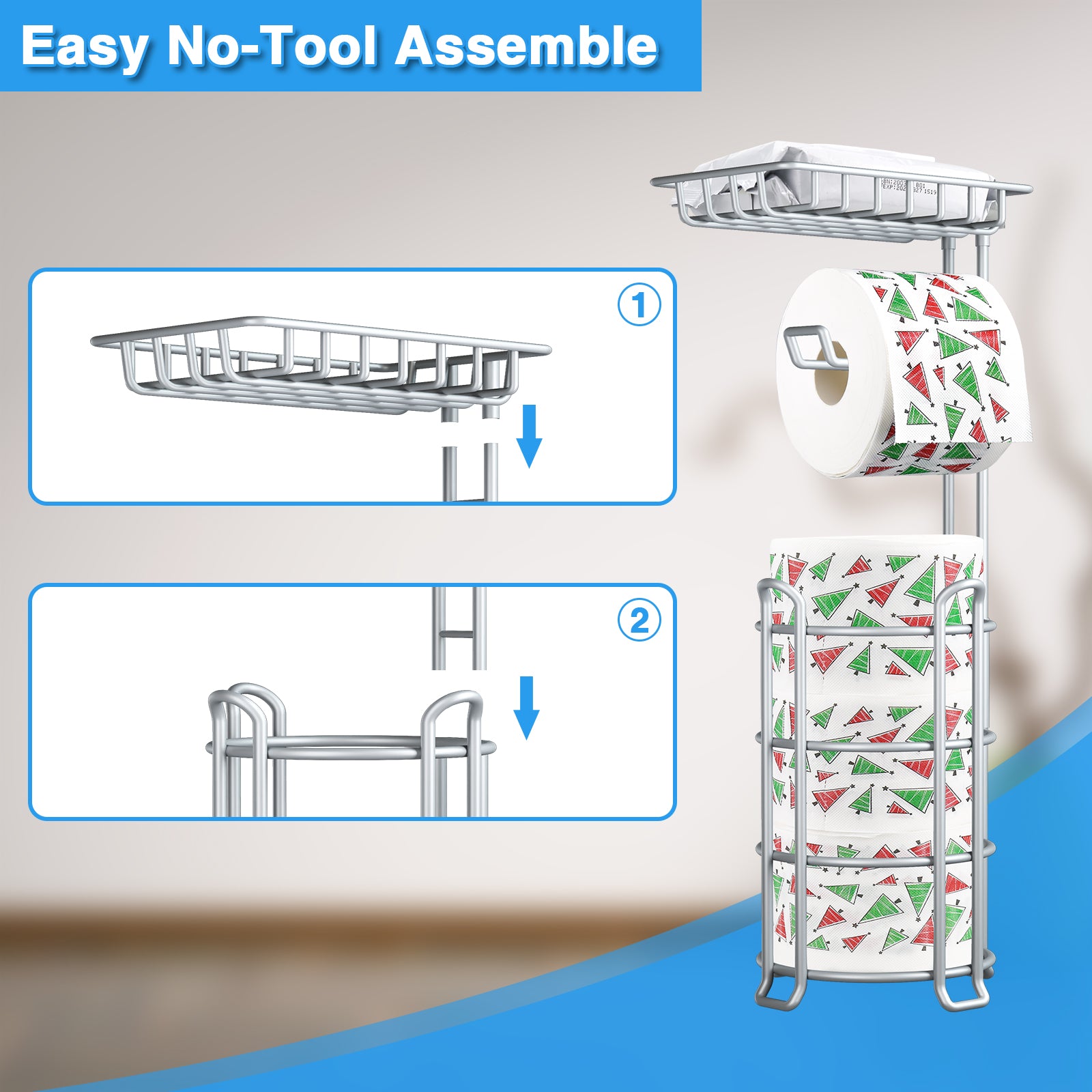 Upgrade Freestanding Toilet Paper Holder, Silver Gray Toilet Tissue Holders Stand with Top Shelf, Bathroom Paper Roll Storage Rack